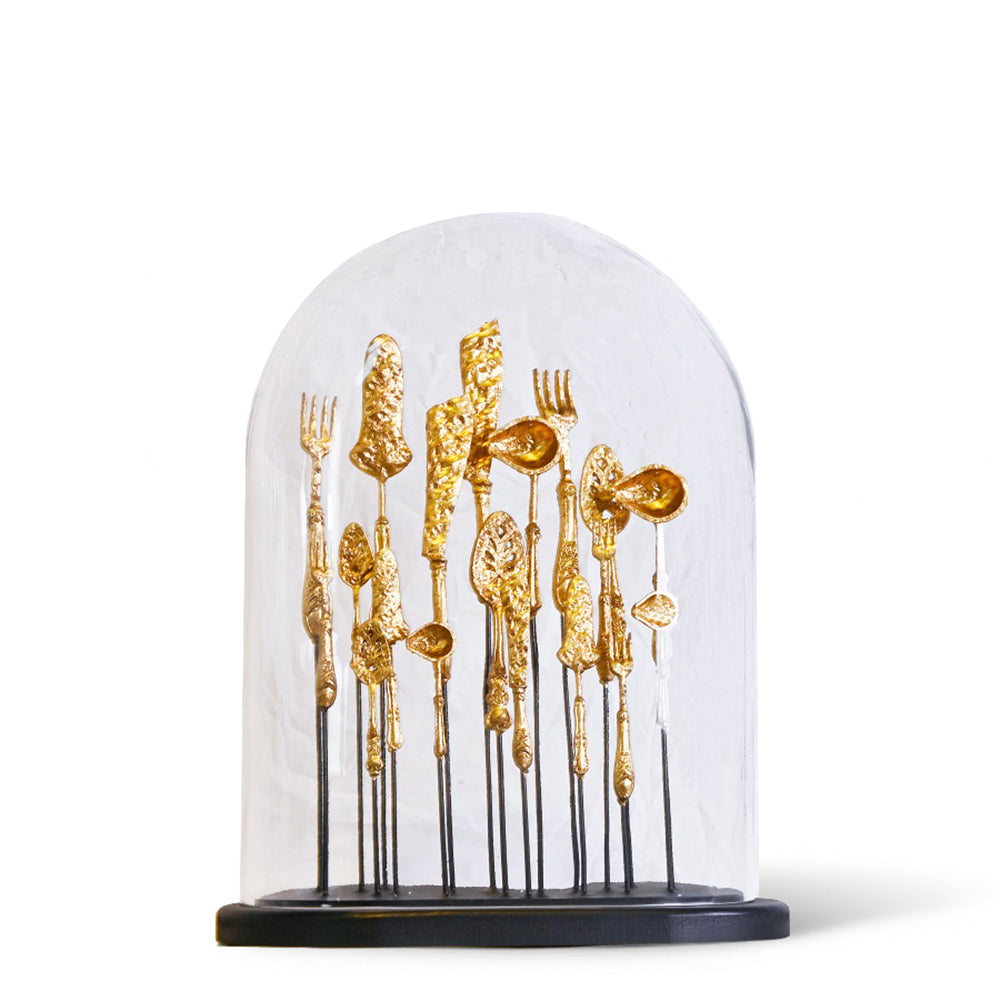 A striking decorative accent, the Cutlery on Oval Globe brings character and visual interest to any space. Reimagining functional household items through an artistic, sculptural lens, this artistic piece adds visual appeal and depth with a textured finish and presentation within a glass dome, housed on a black oval base.