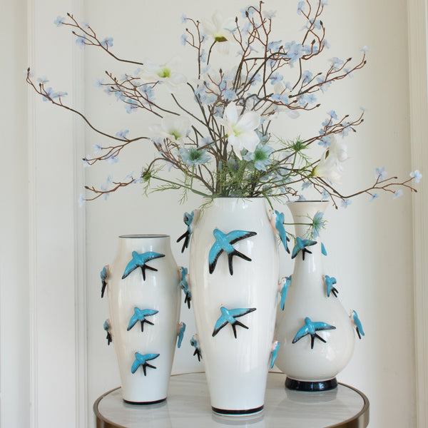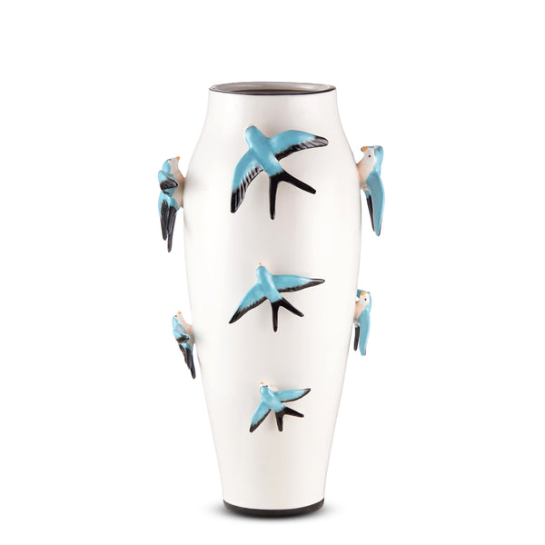 Unique flower vase decorated with birds. This vase has a white vintage finish and features almost real looking colorful birds and looking at the details you would almost think that these birds could fly away. Connoisseurs can tell by the colors and beautifully finished details that these vases are handmade.